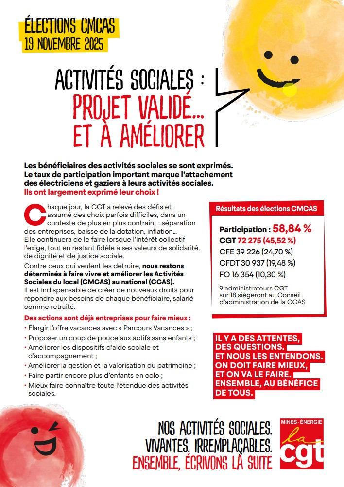 Depuis toujours, la CGT défend, au sein des IEG, une vision sociale différente : un modèle fondé sur l’entraide, la cohésion entre actifs, retraités et familles, et animé par une exigence de justice sociale afin que les activités culturelles et sociales profitent équitablement à toutes et tous.